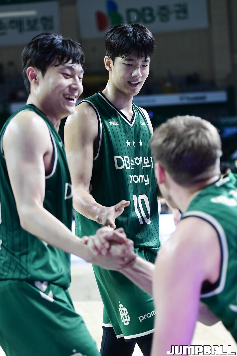 [점프볼=원주/박상혁 기자] 8일 원주 DB 프로미 아레나에서 열린 2025-2026 LG전자 프로농구 원주 DB와 창원 LG의 경기, DB 박인웅과 김보배가 엘런슨을 일으켜 세워주고 있다.
