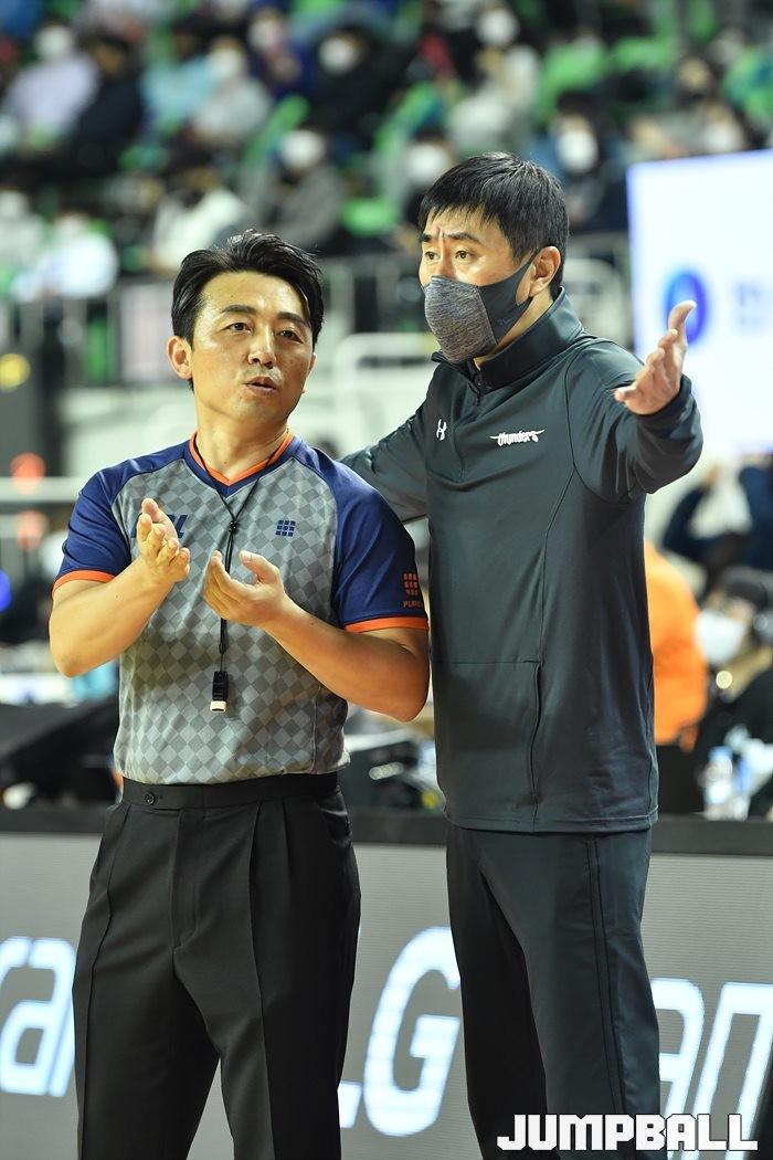 24일 대구실내체육관에서 열린 2021-2022 KGC인삼공사 정관장 프로농구 대구 한국가스공사와 서울 삼성의 경기, 삼성 이상민 감독이 심판 판정에 어필하고 있다.
