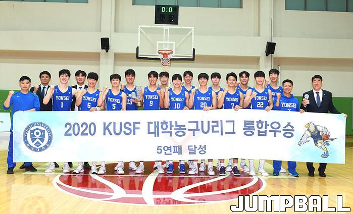 [점프볼=이천/문복주기자] 18일 경기도 이천 LG챔피언스파크에서 열린 2020 KUSF 대학농구 U-리그 남대부 결승전으로 고려대와 연세대의 경기, 연세대가 83-80으로 고려대를 물리치고 짜릿한 우승을 차지한 선수들이 기념촬영을 하고 했다.