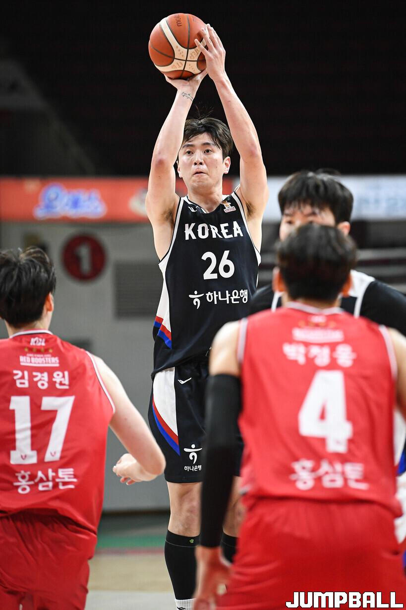 [점프볼=안양/유용우 기자] 25일 안양 정관장 아레나에서 열린 2027 FIBA(국제농구연맹) 농구 월드컵 아시아 예선에 출전하는 남자농구대표팀과 정관장의 연습경기, 대표팀 강상재가 공격을 시도하고 있다.