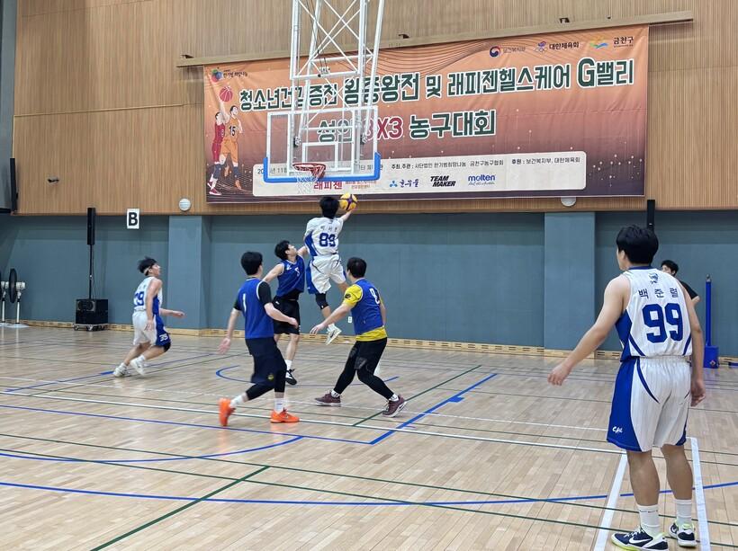 사단법인 한기범희망나눔은 16일 금나래문화체육센터에서 사단법인 한기범희망나눔, 금천구농구협회 주최 및 주관, 보건복지부와 대한체육회의 후원으로 ‘청소년 건강증진 왕중왕전 및 래피젠헬스케어 G밸리 성인 3X3 농구대회’를 개최했다.