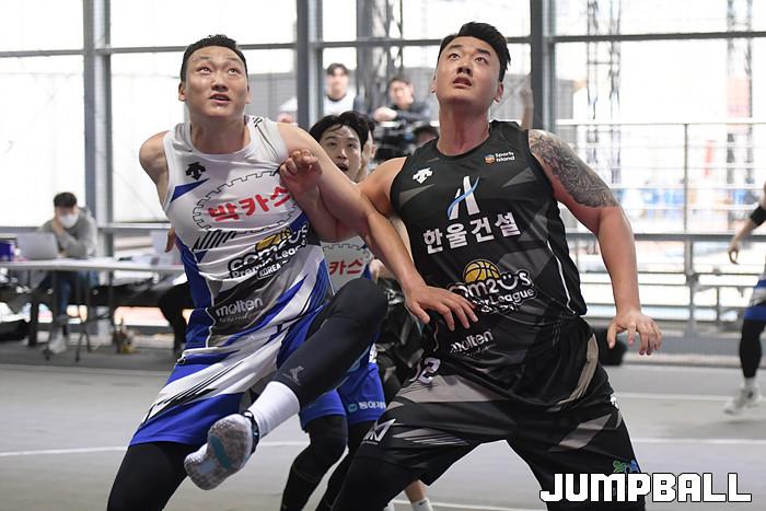 [점프볼=고양/박상혁 기자] 2일 고양 스타필드 스포츠 몬스터 특설코트에서 열린 '컴투스 KOREA 3X3 프리미어리그 2020' 1라운드 경기, 박카스와 한울건설 경기에서 박카스 하재필과 한울건설 류지석이 몸싸움을 벌이고 있다.