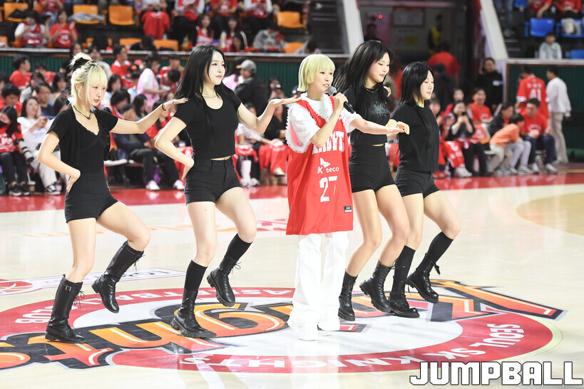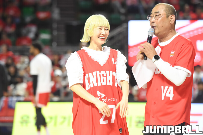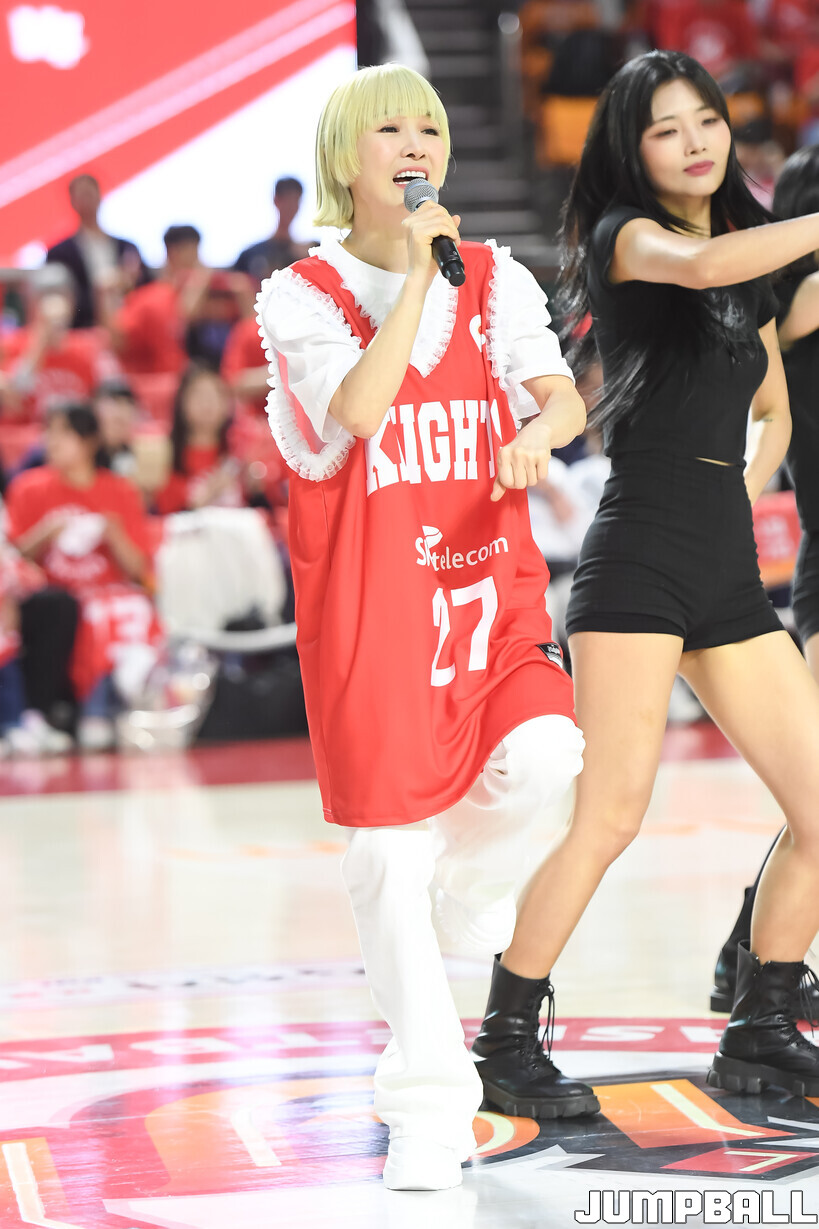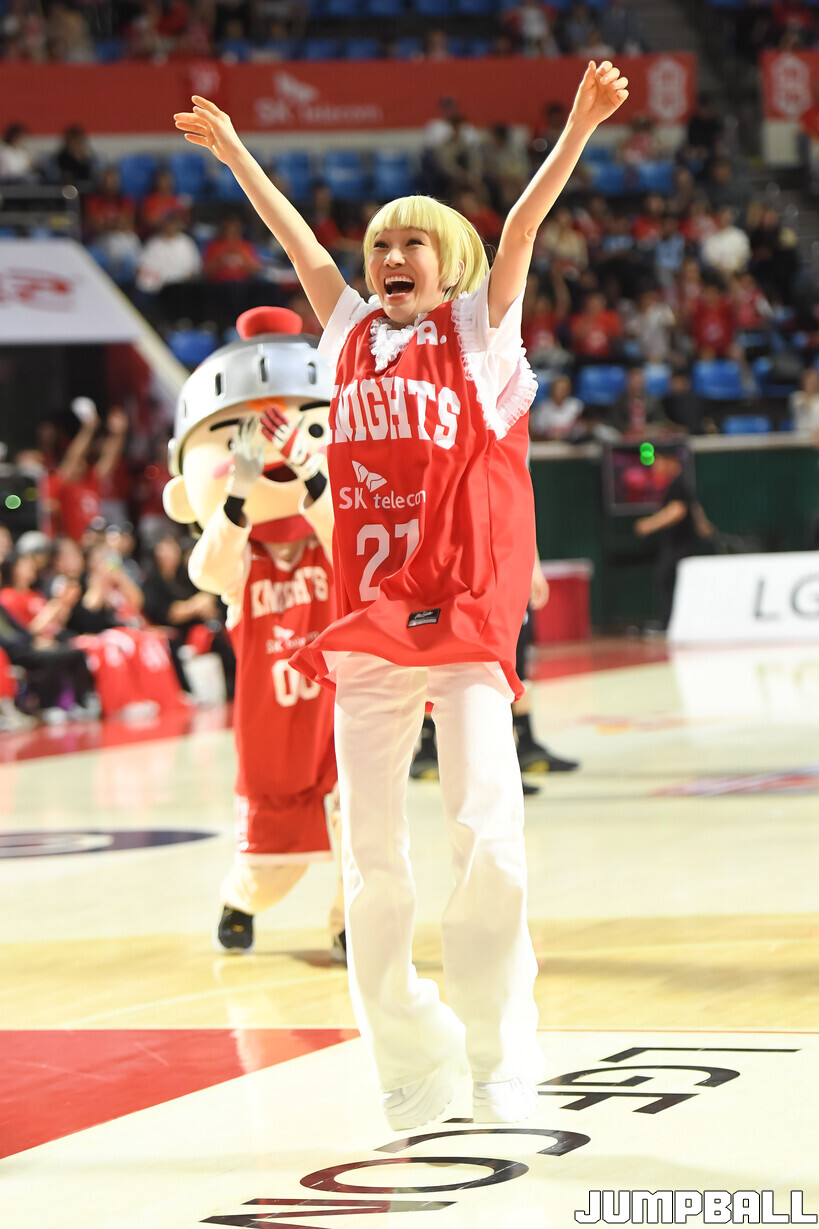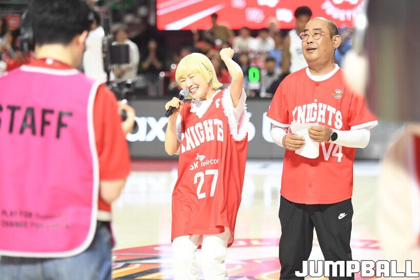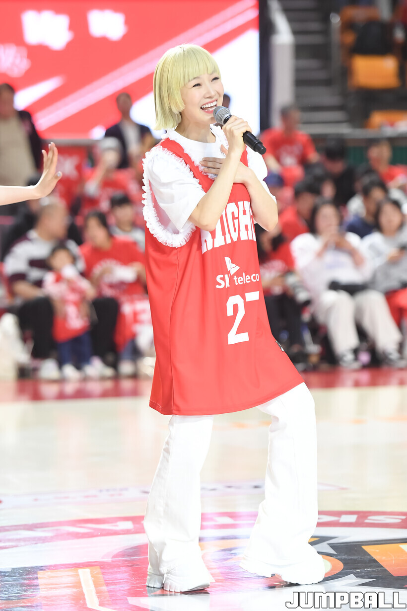 [점프볼=잠실학생/박상혁 기자] 12일 잠실학생체육관에서 열린 2025-2026 LG전자 프로농구 서울 SK와 고양 소노의 6강 플레이오프 1차전 경기, 가수 자두가 경기장을 찾아와 경기 시작 전 시투와 하프 타임 공연을 했다.