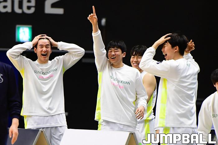 [점프볼=수원/박상혁 기자] 25일 서수원칠보체육관에서 열린 2021 KUSF 대학농구 U-리그 성균관대와 중앙대의 경기, 성균관대 선수들이 벤치에서 환호하고 있다.