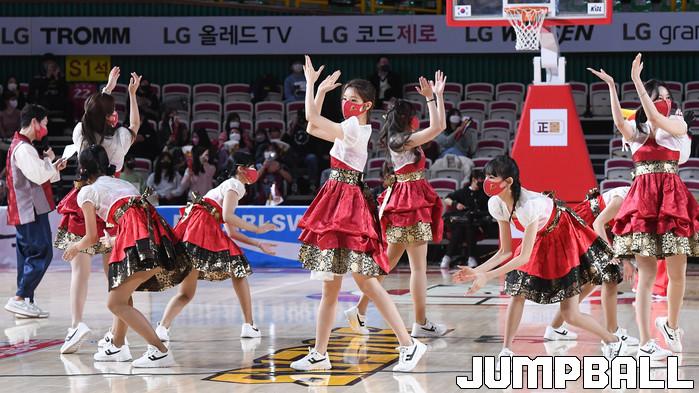 1일 창원실내체육관에서 열린 2021-2022 KGC인삼공사 정관장 프로농구 창원 LG와 전주 KCC의 경기, LG 치어리더가 공연을 하고 있다.