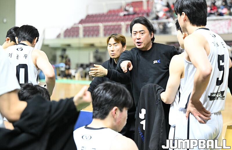 [점프볼=안암/문복주 기자] 12일 고려대학교 화정체육관에서 2025 KUSF 대학농구 U-리그 남자 대학부 챔피언결정전으로 고려대와 성균관대의 경기, 성균관대 김상준 감독이 작전을 지시하고 있다/.