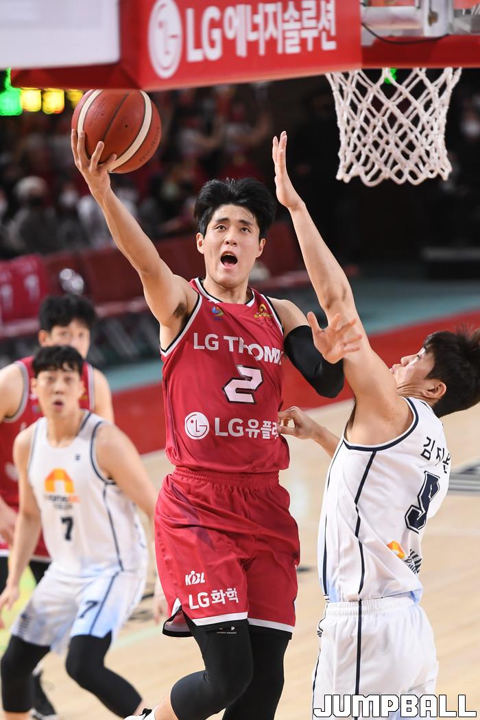 1일 창원실내체육관에서 열린 2021-2022 KGC인삼공사 정관장 프로농구 창원 LG와 전주 KCC의 경기, LG 이승우가 레이업슛을 시도하고 있다.