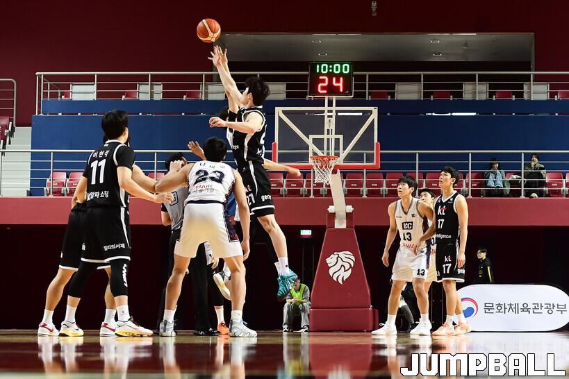 [점프볼=용인/박상혁 기자] 9일 경희대학교 국제캠퍼스 선승관에서 열린 2025-2026 KBL D리그 수원 KT와 부산 KCC의 경기, 점프볼로 경기가 시작되었다.