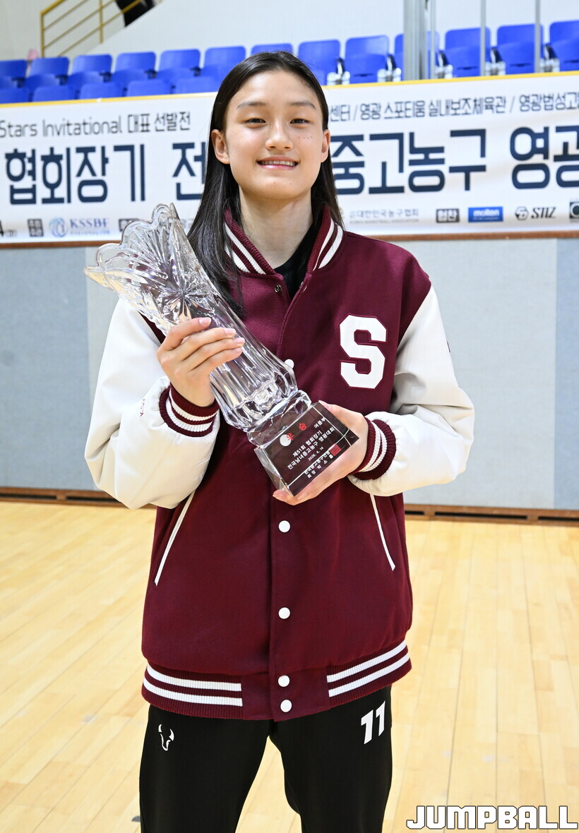 숙명여중 3학년 김서율은 12일 전라남도 영광군 영광군 영광 스포티움 국민체육센터에서 열린 제51회 협회장기 전국남녀중고농구대회 여중부 결승전 봉의중과의 경기에서 22점 2리바운드 2어시스트로 맹활약했다. 김서율을 앞세운 숙명여중은 78-52로 승리하며 우승을 차지했다. MVP는 당연히 김서율의 몫이었다.