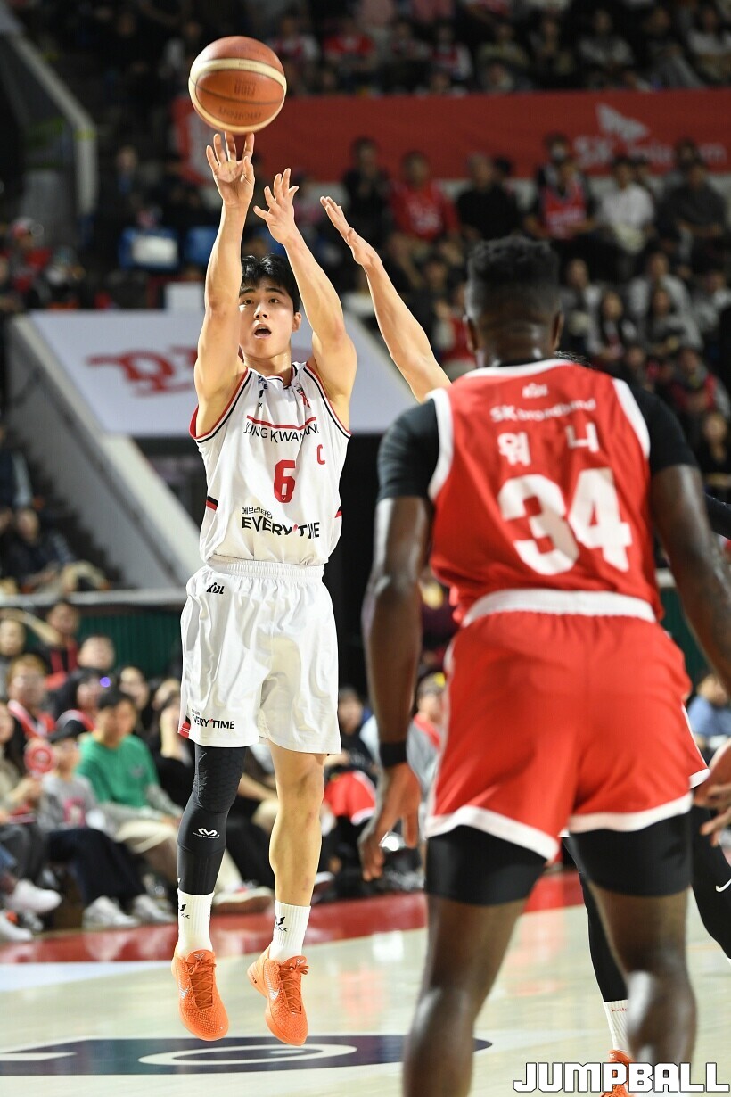 [점프볼=잠실/유용우 기자] 15일 잠실학생체육관에서 열린 2025-2026 LG전자 프로농구 서울 SK과 안양 정관장의 경기, 정관장 박지훈이 상대방 수비를 피해 3점슛을 시도하고 있다.