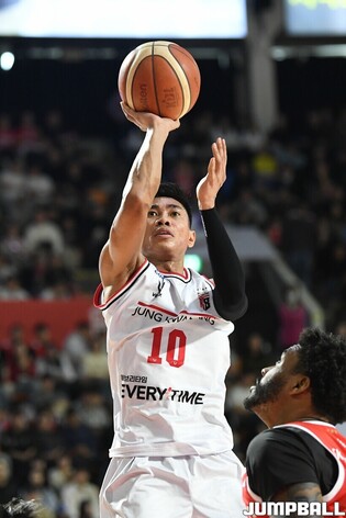 [점프볼=잠실/유용우 기자] 15일 잠실학생체육관에서 열린 2025-2026 LG전자 프로농구 서울 SK과 안양 정관장의 경기, 정관장 문유현이 수비와 공간을 벌리며 슛을 던지고 있다.