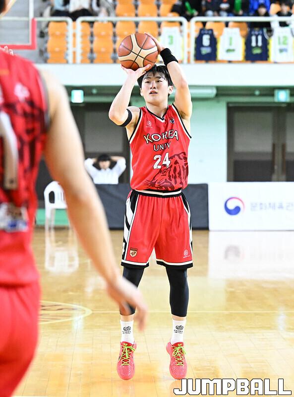 [점프볼=안암/문복주 기자] 12일 고려대학교 화정체육관에서 2025 KUSF 대학농구 U-리그 남자 대학부 챔피언결정전으로 고려대와 성균관대의 경기, 고려대 문유현이 3점슛을 시도하고 있다.
