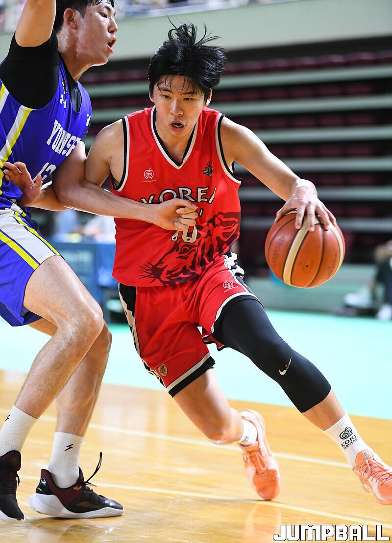 [점프볼=안암 문복주 기자] 5일 고려대 화정체육관에서 열린 2025 KUSF 대학농구 U-리그 고려대와 연세대의 경기, 고려대 윤기찬이 돌파를 시도하고 있다.