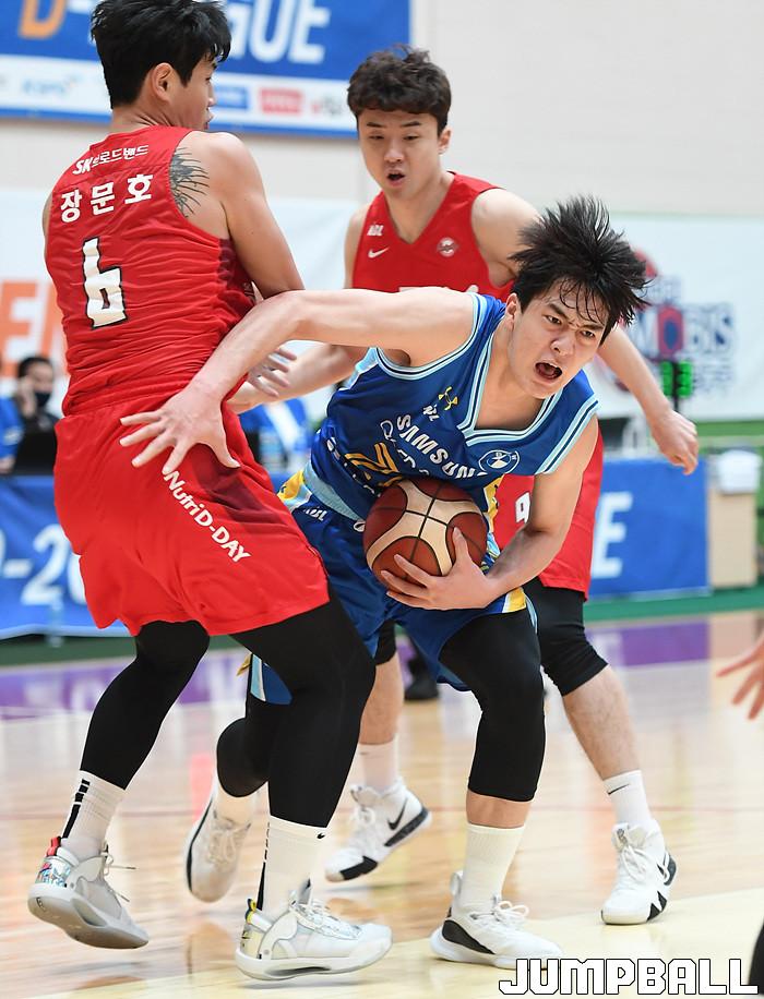 [점프볼=이천/문복주 기자] 31일 이천 LG챔피언스파크 실내농구장에서 열린 2020-2021 KBL D리그 플레이오프 준결승 SK와 삼성의 경기, 삼성 차민석이 두명의 수비사이를 뚫고 있다.