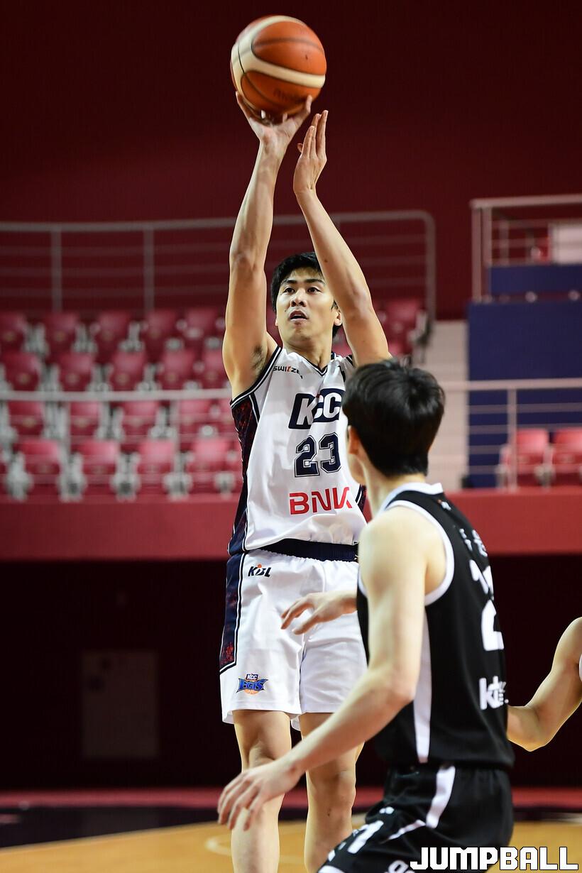 [점프볼=용인/박상혁 기자] 9일 경희대학교 국제캠퍼스 선승관에서 열린 2025-2026 KBL D리그 수원 KT와 부산 KCC의 경기, KCC 윌리엄 나바로가 슛을 시도하고 있다.