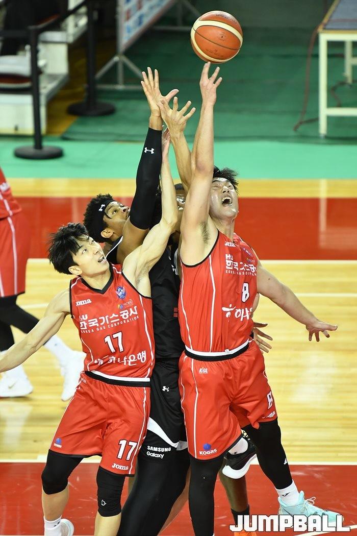 24일 대구실내체육관에서 열린 2021-2022 KGC인삼공사 정관장 프로농구 대구 한국가스공사와 서울 삼성의 경기, 한국가스공사 신승민이 리바운드 경합을 하고 있다.
