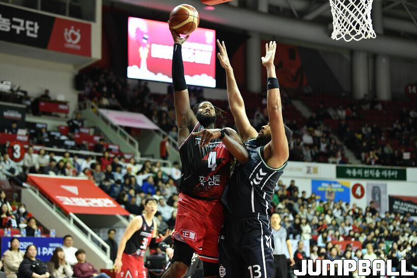 31일 안양실내체육관에서 열린 2023-2024 정관장 프로농구 안양 정관장과 원주 DB의 경기, 정관장 카터가 공격하고 있다. [점프볼=안양/유용우 기자]