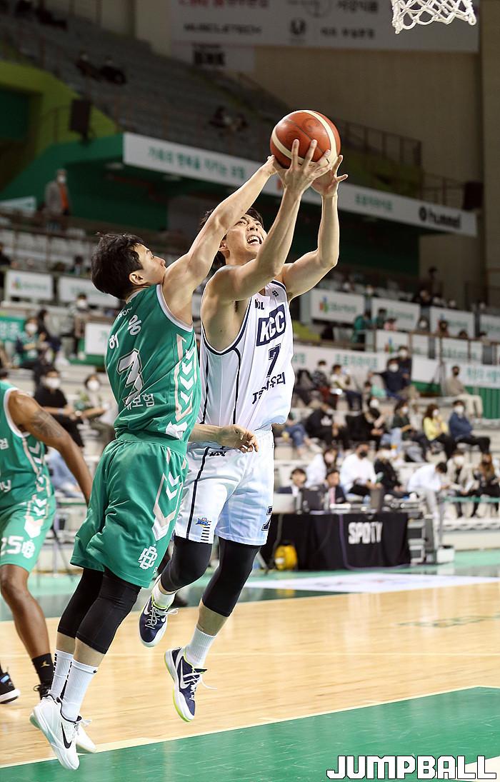 [점프볼=원주/한명석 기자] 25일 원주종합체육관에서 열린 2020-2021 현대모비스 프로농구 원주DB와 전주KCC와의 경기, 전주 KCC 정창영 선수가 빠른 속도로 레이업 슛을 시도하고 있다.
