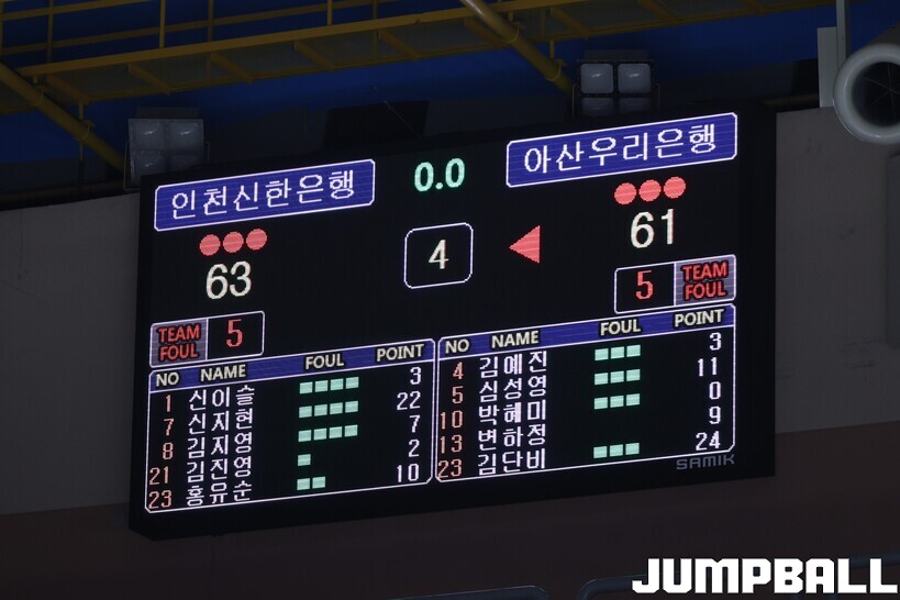 [점프볼=아산/김소희 인터넷기자] 인천 신한은행은 28일 아산이순신체육관에서 열린 BNK금융 2025~2026 여자프로농구 정규리그 아산 우리은행과의 경기에서 63-61로 승리했다.