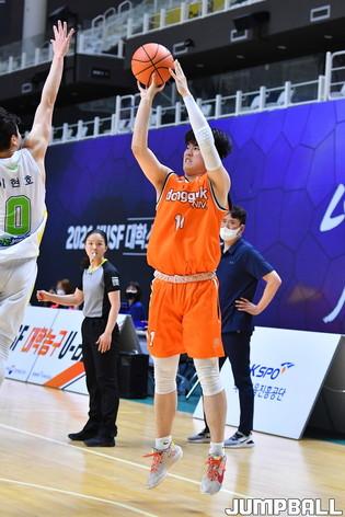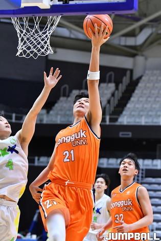 [점프볼=수원/홍기웅 기자] 5일 수원 서수원칠보체육관에서 열린 '2021 KUSF 대학농구 U-리그 3차대회' 경희대와 건국대의 경기. 건국대 조환희가 더블클러치로 득점에 성공하고 있다.