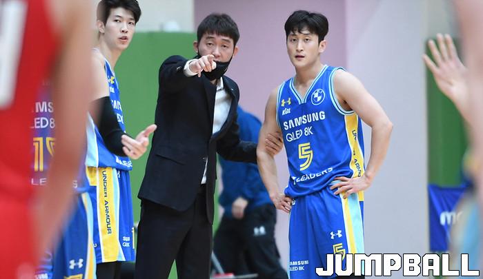 [점프볼=이천/문복주 기자] 31일 이천 LG챔피언스파크 실내농구장에서 열린 2020-2021 KBL D리그 플레이오프 준결승 SK와 삼성의 경기, 삼성 양은성 코치가 공격 위치를 알려주고 있다.