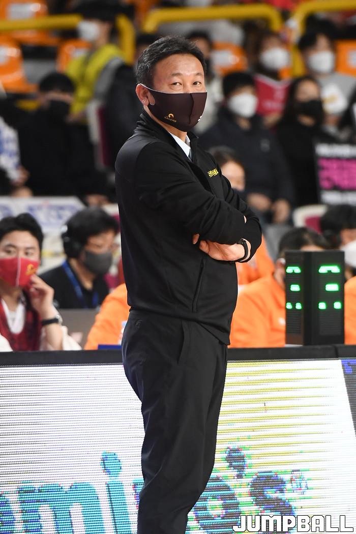 1일 창원실내체육관에서 열린 2021-2022 KGC인삼공사 정관장 프로농구 창원 LG와 전주 KCC의 경기, LG 조성원 감독이 경기를 지켜보고 있다.