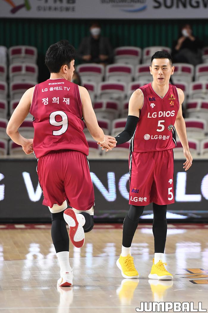 [점프볼=창원/박상혁 기자] 7일 창원실내체육관에서 열린 2020-2021 현대모비스 프로농구 창원 LG와 인천 전자랜드의 경기, LG 이관희가 정희재와 하이파이브를 하고 있다.