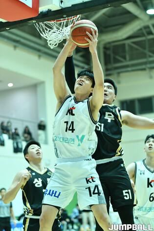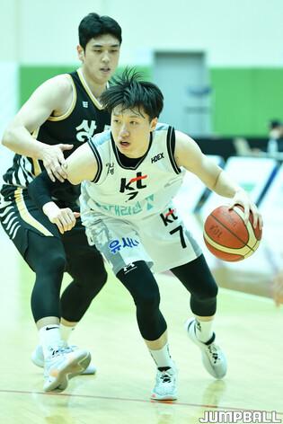 [점프볼=이천/유용우 기자] 10일 이천 LG챔피언스파크에서 열린 2023-2024 KBL D리그 상무와 KT의 경기, 상무 한승희가 KT 이두원의 공격을 수비하고 있다.