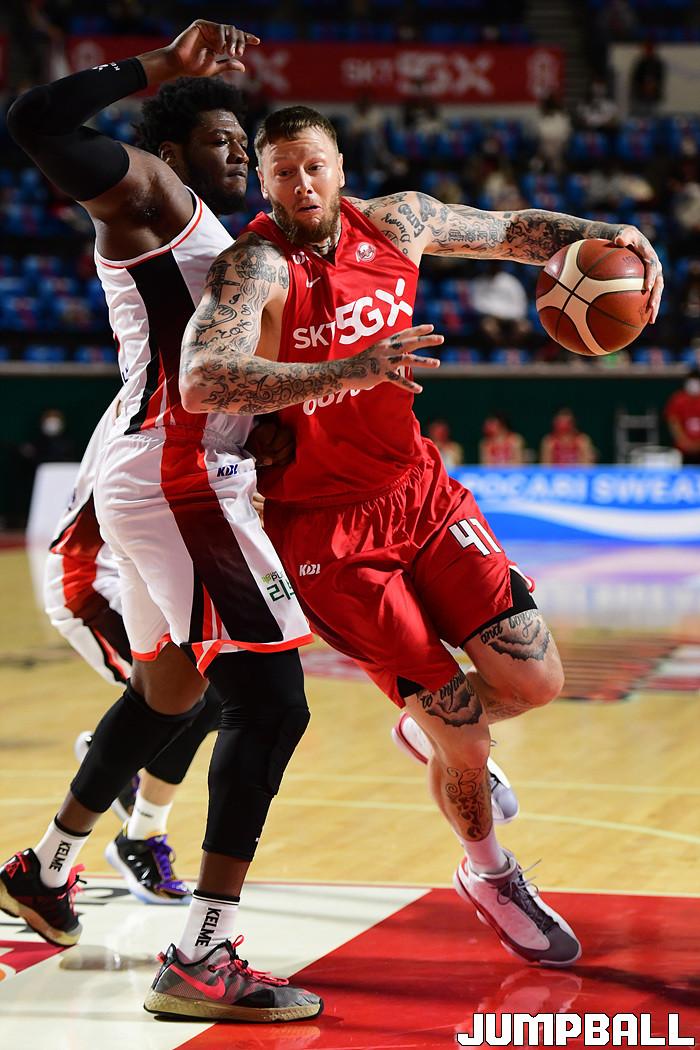 [점프볼=잠실학생/박상혁 기자] 25일 잠실학생체육관에서 열린 2020-2021 현대모비스 프로농구 서울 SK와 부산 KT의 경기, SK 닉 미네라스가 공격을 시도하고 있다.