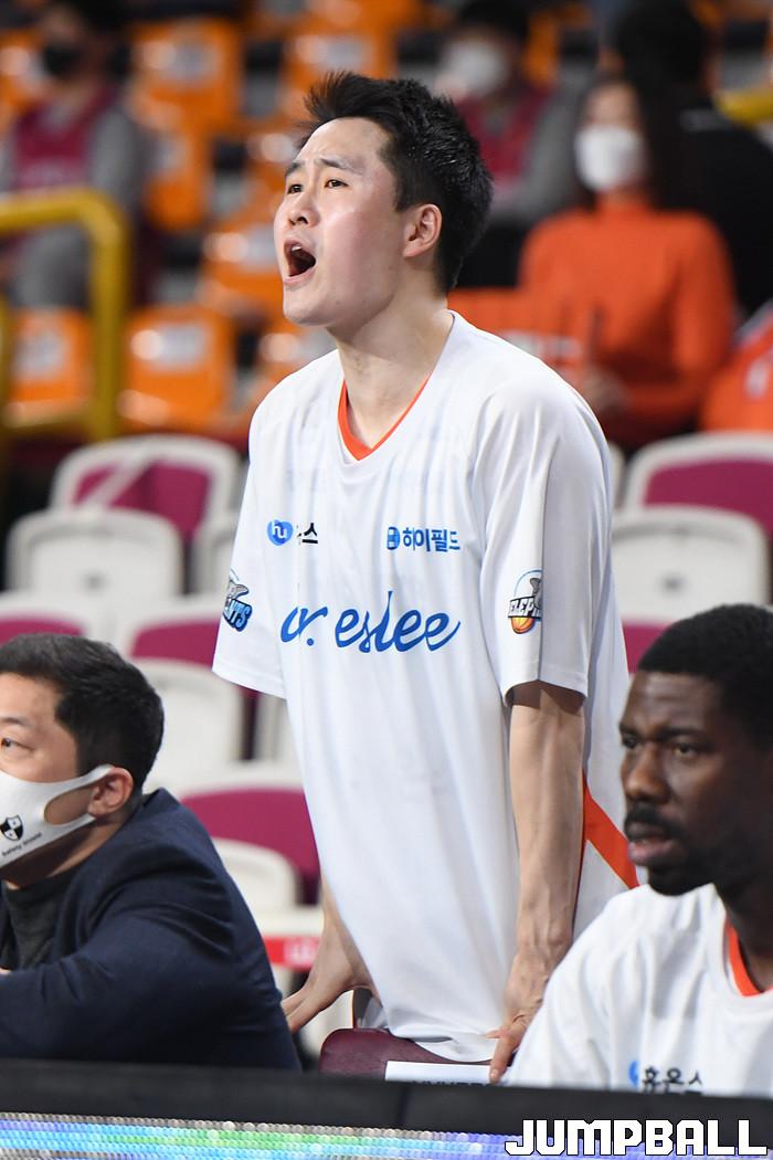 [점프볼=창원/박상혁 기자] 7일 창원실내체육관에서 열린 2020-2021 현대모비스 프로농구 창원 LG와 인천 전자랜드의 경기, 전자랜드 임준수가 선수들을 응원하고 있다.