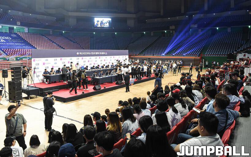 [점프볼=부산/박상혁 기자] 25일 부산사직체육관에서 진행된 부산KCC이지스 연고지 협약식 및 출정식, 부산KCC 선수단이 협약식 시작 전 팬 사인회를 하고 있다.