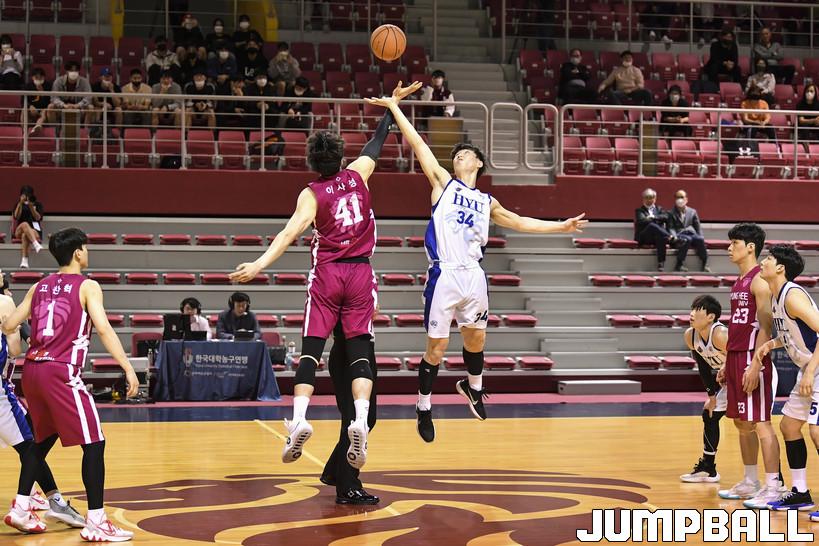 3일 경희대 국제캠퍼스 선승관에서 열린 2022 KUSF 대학농구 U-리그 경희대와 한양대의 경기, 심판의 점프볼로 경희대와 한양대의 경기가 시작되고 있다.