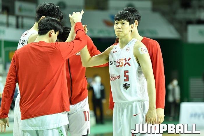 [점프볼=원주/유용우 기자] 13일 원주 종합체육관에서 열린 2020-2021 현대모비스 프로농구 원주 DB와 서울 SK의 경기, SK 김선형이 동료들과 선전을 다짐하고 있다.