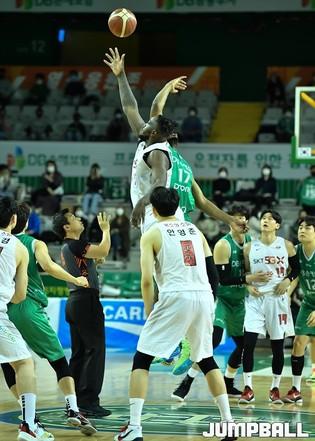 [점프볼=원주/유용우 기자] 13일 원주 종합체육관에서 열린 2020-2021 현대모비스 프로농구 원주 DB와 서울 SK의 경기, DB 얀테 메이튼이 슛을 던지고 있다.