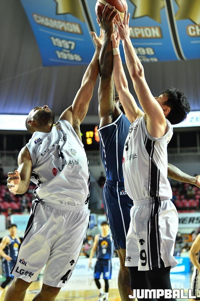 [점프볼=전주/유용우 기자] 06일 전주실내체육관에서 열린 2020-2021 현대모비스 프로농구 전주 KCC와 창원 LG의 경기, LG 리온 윌리엄스와 KCC 라건아가 리바운드 경합을 벌이고 있다.