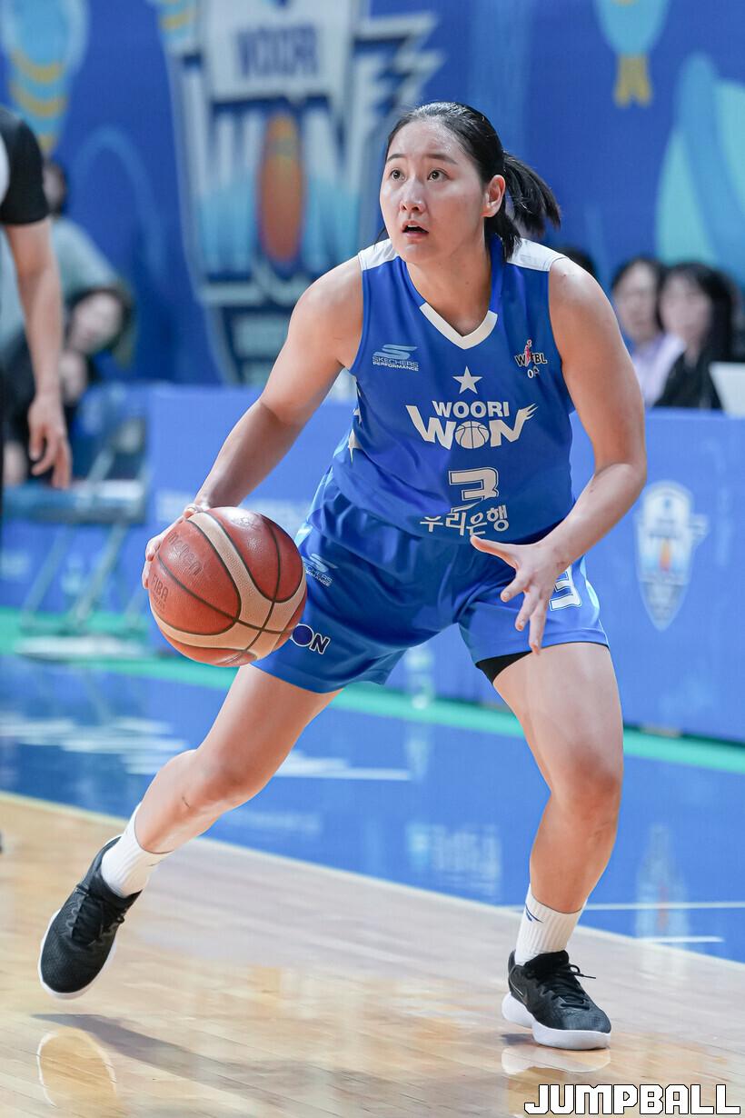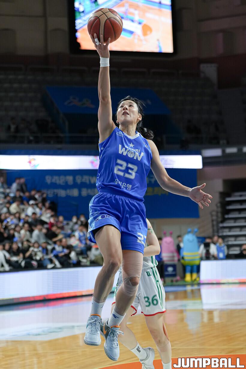 1쿼터를 18-21로 뒤진 우리은행은 2쿼터 미야사카 모모나의 3점슛과 레이업으로 분위기를 가져왔다. 고서연에게 잇달아 3점슛을 맞았지만 변하정과 김단비가 득점을 올렸다. 하나은행이 고서연을 앞세워 다시 도망갔으나 스나가와 나츠키가 자유투로 득점을 더했다. 한엄지가 골밑슛을 성공시킨 우리은행은 35-35, 동점을 만들며 전반전을 마쳤다.