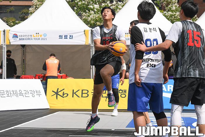 [점프볼=서울/박상혁 기자] 11일 서울신문사앞 특설코트에서 KB국민은행 LIIV M KBA 3X3 코리아투어 2일차 경기가 열렸다. 고등부 S가 골밑에서 슛을 시도하고 있다.