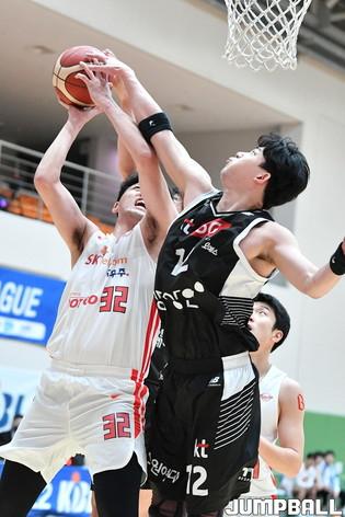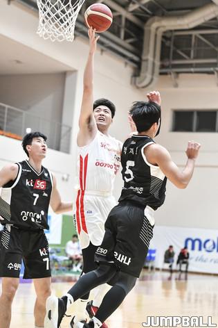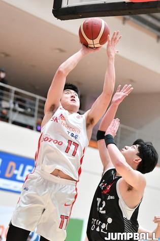 24일 이천 LG챔피언스파크 실내농구장에서 열린 2021-2022 KBL D리그 KT와 SK의 경기. SK 장문호가 높이 뛰어올라 레이업을 올려넣고 있다.
