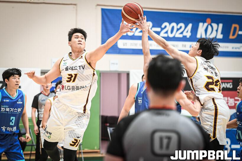 [점프볼=이천/박상혁 기자] 27일 이천 LG챔피언스파크에서 열린 2023-2024 KBL D리그 창원 LG와 대구 한국가스공사의 경기, LG 박정현이 리바운드를 시도하고 있다.