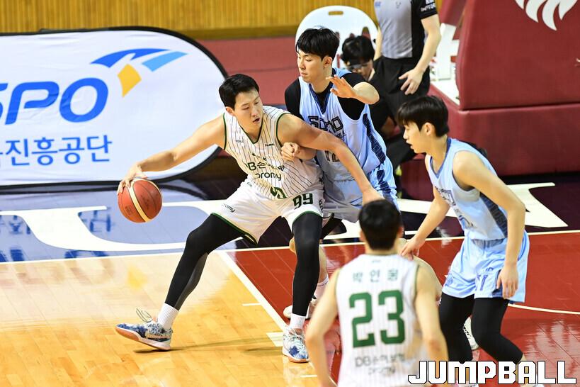 [점프볼=용인/박상혁 기자] 25일 경희대 국제캠퍼스 선승관에서 열린 2025-2026 KBL D리그 고양 소노와 원주 DB의 경기, DB 이윤수가 소노 강지훈을 상대로 포스트업 공격을 시도하고 있다.