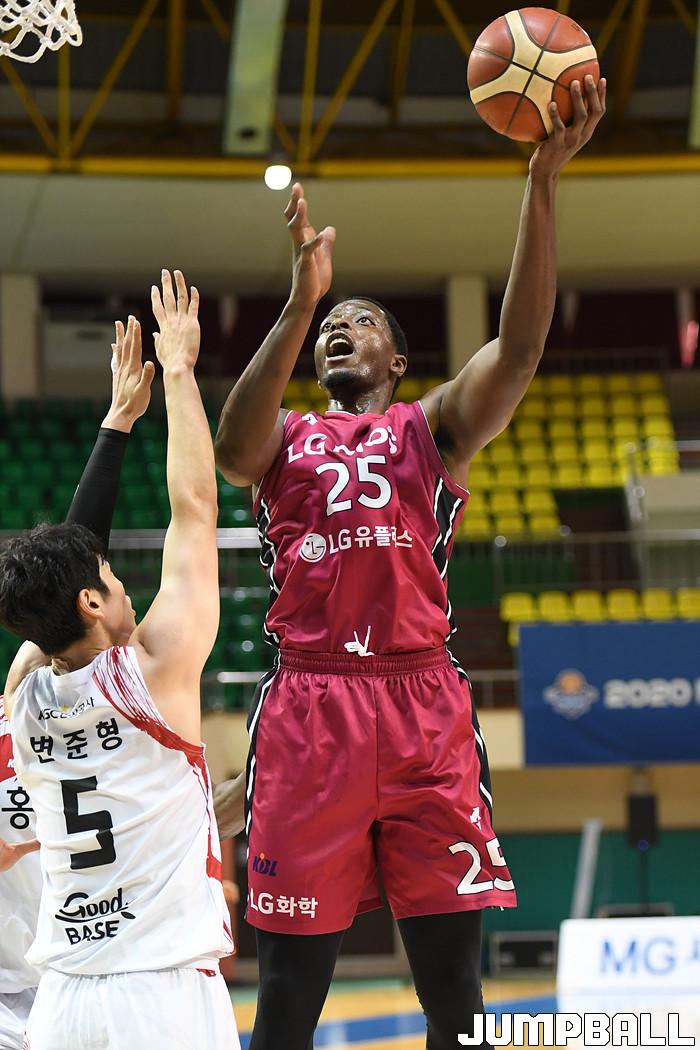 [점프볼=군산/박상혁 기자] 24일 군산월명실내체육관에서 열린 2020 MG새마을금고 KBL컵 안양 KGC인삼공사와 창원 LG의 경기, LG 라렌이 골밑에서 슛을 시도하고 있다.