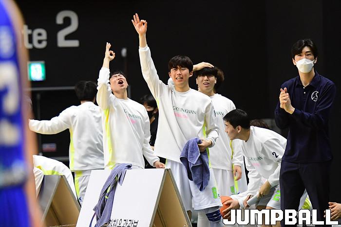 [점프볼=수원/박상혁 기자] 25일 서수원칠보체육관에서 열린 2021 KUSF 대학농구 U-리그 성균관대와 중앙대의 경기, 성균관대 선수단이 환호하고 있다.