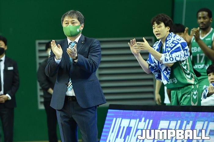 [점프볼=원주/유용우 기자] 14일 원주 종합체육관에서 열린 2020-2021 현대모비스 프로농구 원주 DB와 서울 삼성의 경기, DB 이상범 감독이 선수들의 플레이에 만족감을 드러내고 있다.