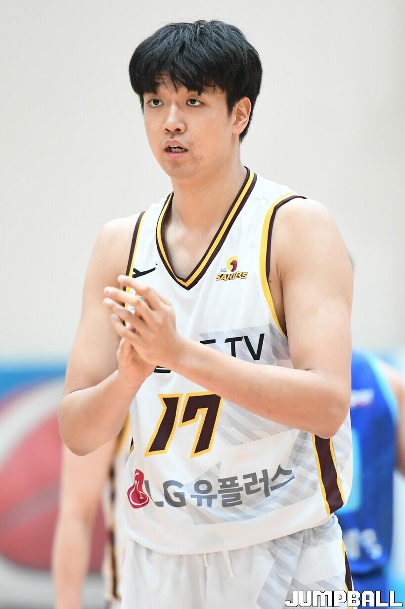 [점프볼=이천/박상혁 기자] 27일 이천 LG챔피언스파크에서 열린 2023-2024 KBL D리그 창원 LG와 대구 한국가스공사의 경기, LG 이강현이 박수를 치고 있다.