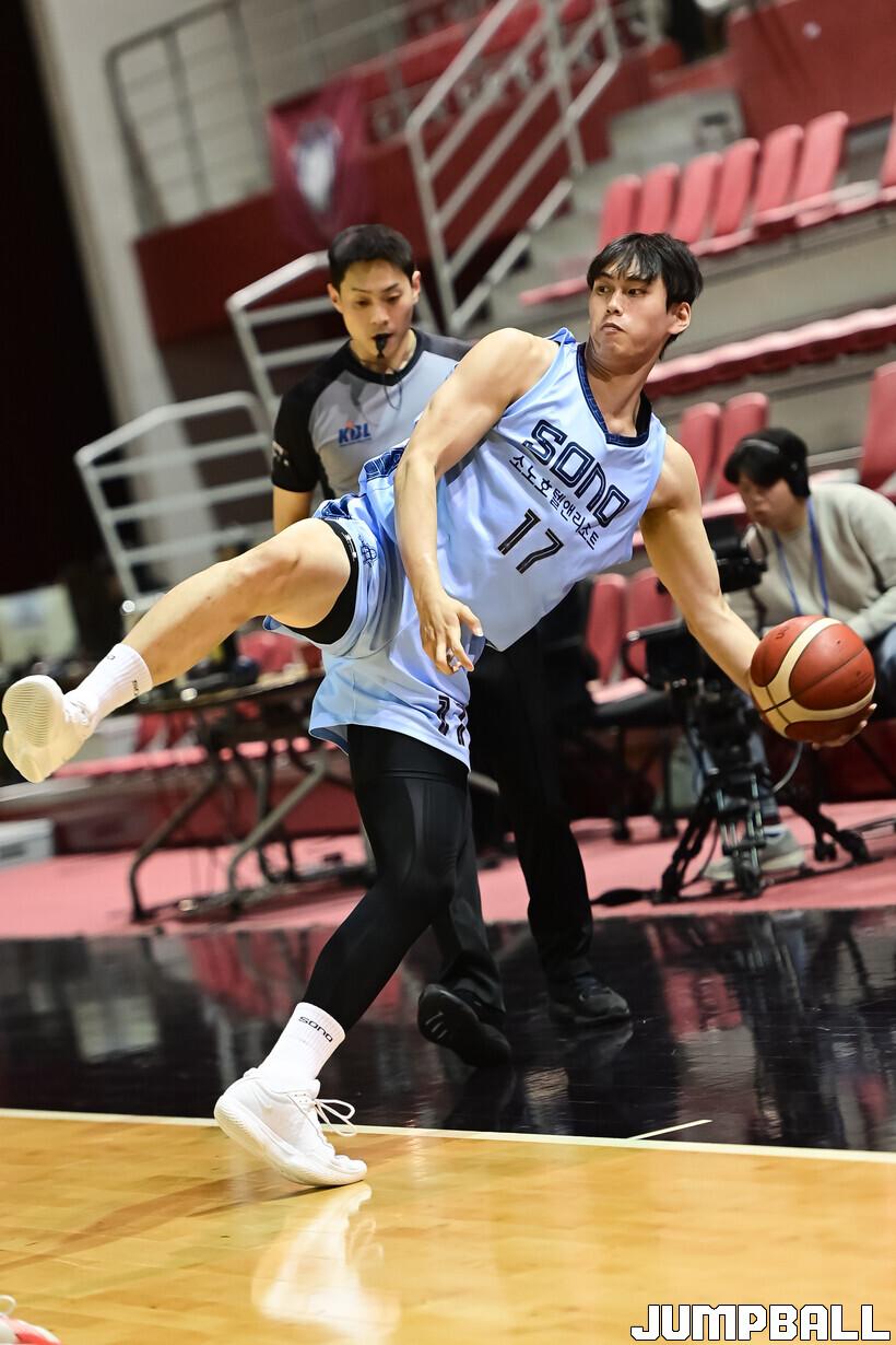 [점프볼=용인/박상혁 기자] 25일 경희대 국제캠퍼스 선승관에서 열린 2025-2026 KBL D리그 고양 소노와 원주 DB의 경기, 소노 신지원이 사이드 라인 밖으로 나가는 볼을 살려내고 있다.