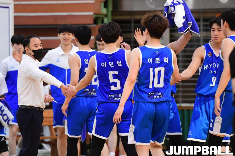 4일 명지대 체육관에서 열린 2022 KUSF 대학농구 U리그 명지대와 단국대의 경기, 명지대 선수단이 환호하고 있다.
