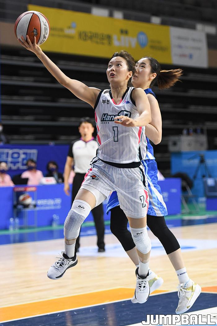 [점프볼=아산/박상혁 기자] 18일 아산이순신체육관에서 열린 'KB국민은행 Liiv M 2020-2021 여자프로농구' 우리은행과 하나원큐의 경기, 하나원큐 신지현이 레이업슛을 시도하고 있다.