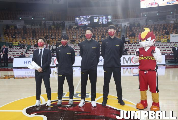 [점프볼=정을호 기자] 5 창원실내체육관에서 열린 2020-2021 현대모비스 프로농구  창원LG 원주 DB 경기, LG 신인선수들이 팬들에거 첫인사를 드리고 있다.