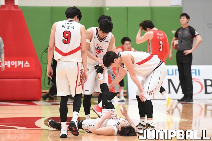 [점프볼=이천/박상혁 기자] 11일 이천 LG챔피언스파크에서 열린 2020-2021 현대모비스 프로농구 KBL 가리그 2차대회 인천 전자랜드와 울산 현대모비스의 준결승 경기, 현대모비스 김영현이 부상으로 코트 바닥에 쓰러져 있다.