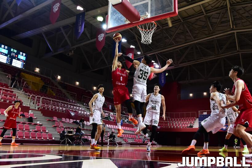 [점프볼=용인/박상혁 기자] 2일 경희대학교 국제캠퍼스 선승관에서 열린 2025-2026 KBL D리그 안양 정관장과 원주 DB의 경기, 정관장 박정웅이 골밑에서 슛을 시도하고 있다.